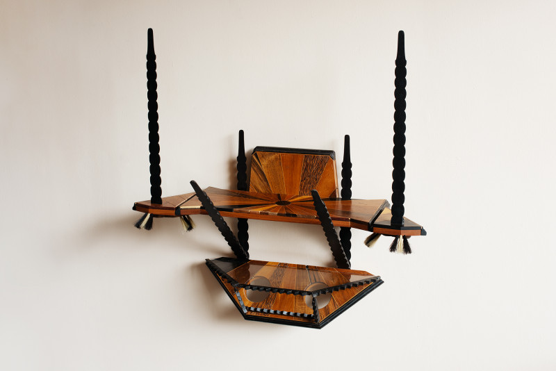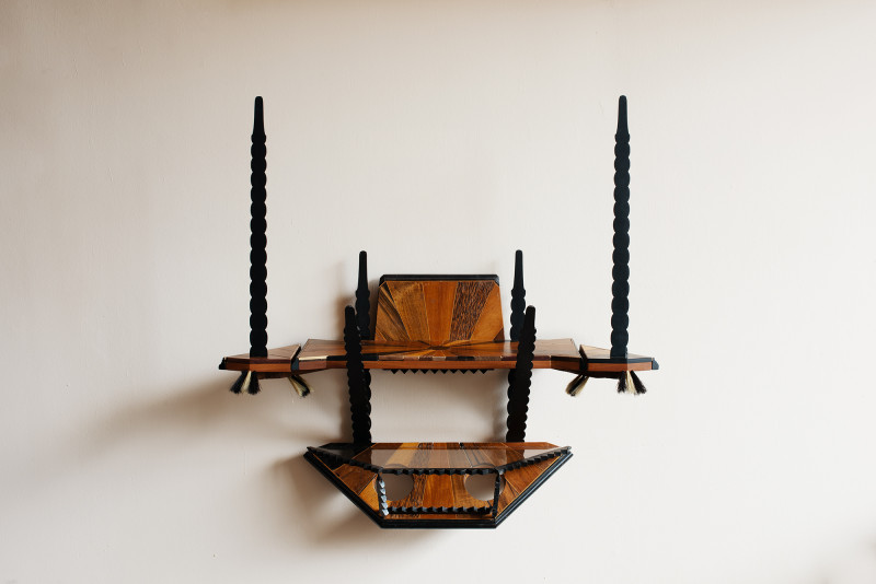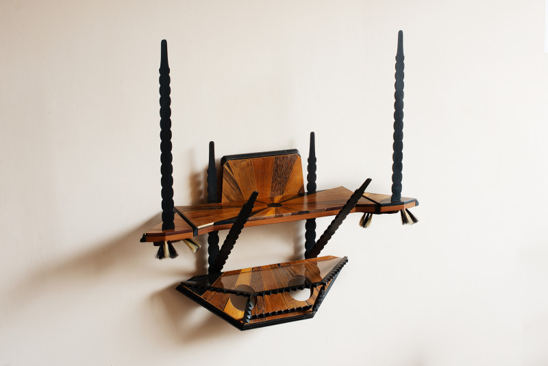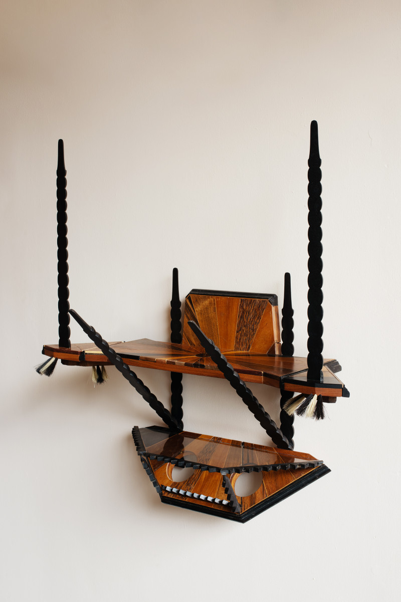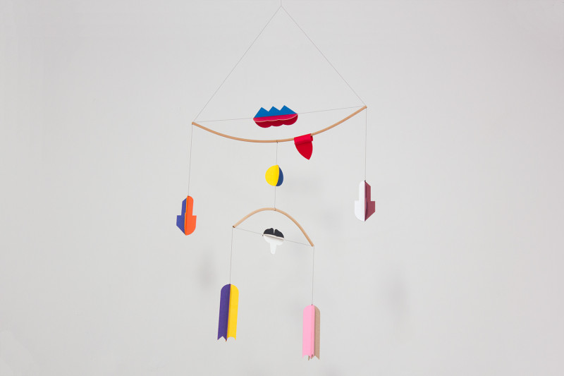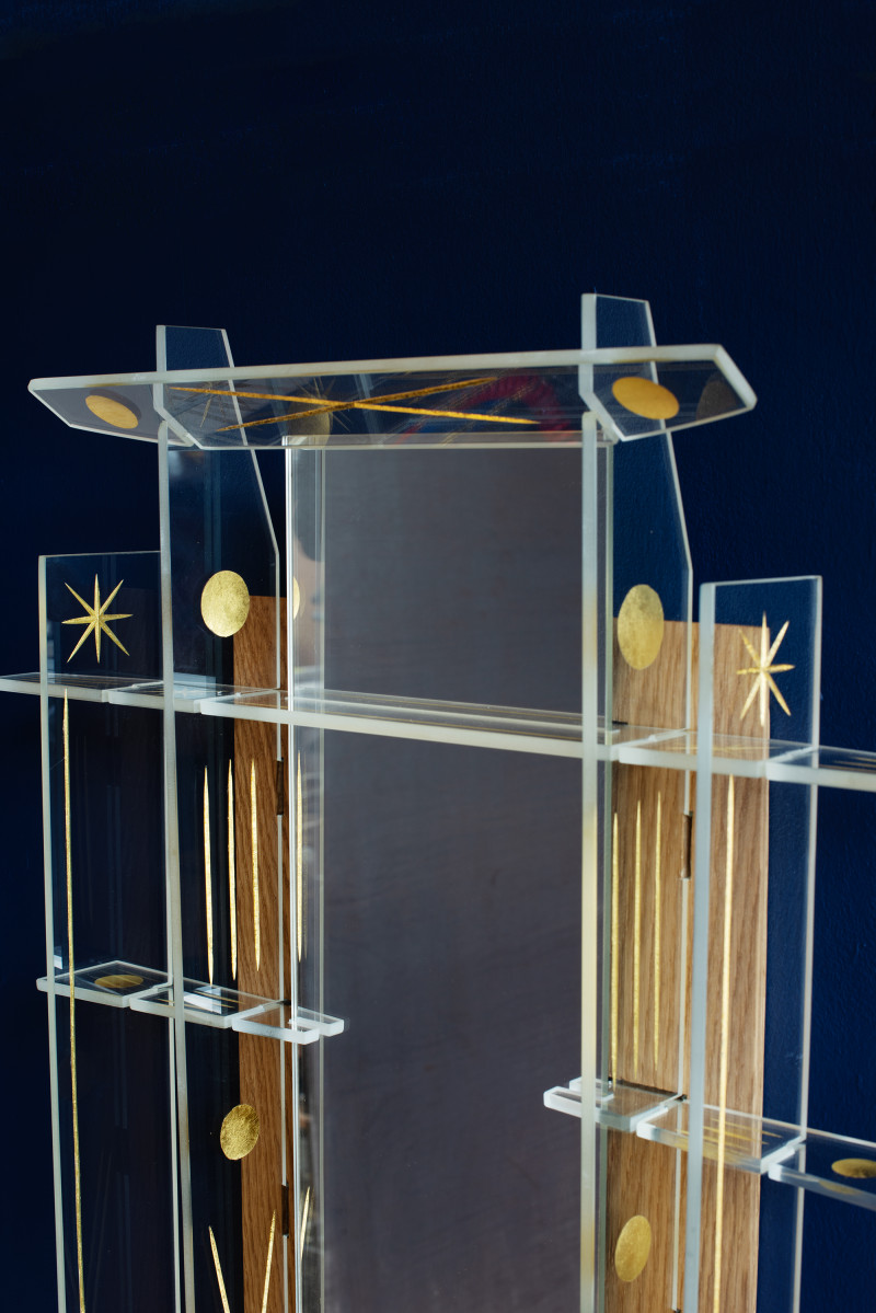 As my background is in furniture design and making, I envisioned the design as an extension of my craft. I came up with the idea of a scaled up pair of shelves supporting a roof. The simple grid structure recalls an extruded Torii shape, which is a gate usually found at the entrance of Shinto shrines. Golden wind chimes hang underneath each of the roof rafters, suspended from red and white striped ribbon – colours which signify celebration in Asia. This is a nod to the ceremonial feeling of this inaugural project commissioned by Olympia.