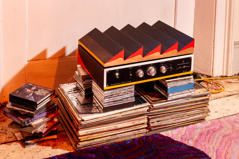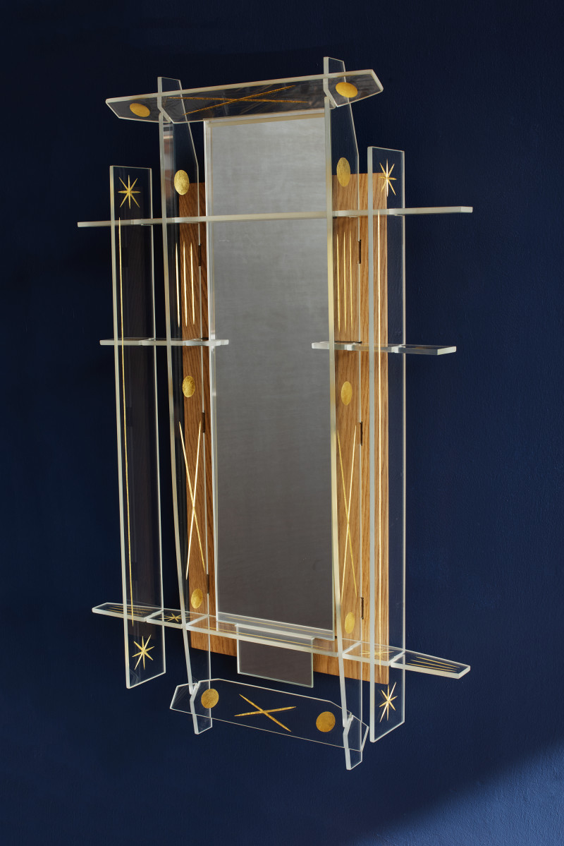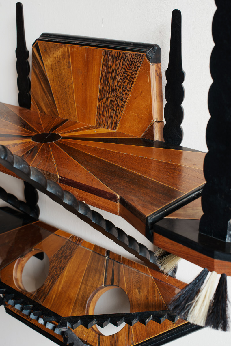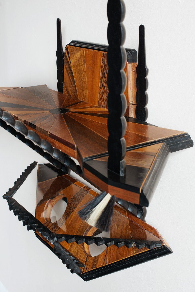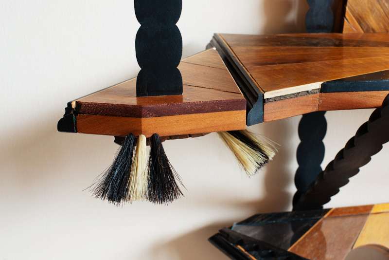 As my background is in furniture design and making, I envisioned the design as an extension of my craft. I came up with the idea of a scaled up pair of shelves supporting a roof. The simple grid structure recalls an extruded Torii shape, which is a gate usually found at the entrance of Shinto shrines. Golden wind chimes hang underneath each of the roof rafters, suspended from red and white striped ribbon – colours which signify celebration in Asia. This is a nod to the ceremonial feeling of this inaugural project commissioned by Olympia.