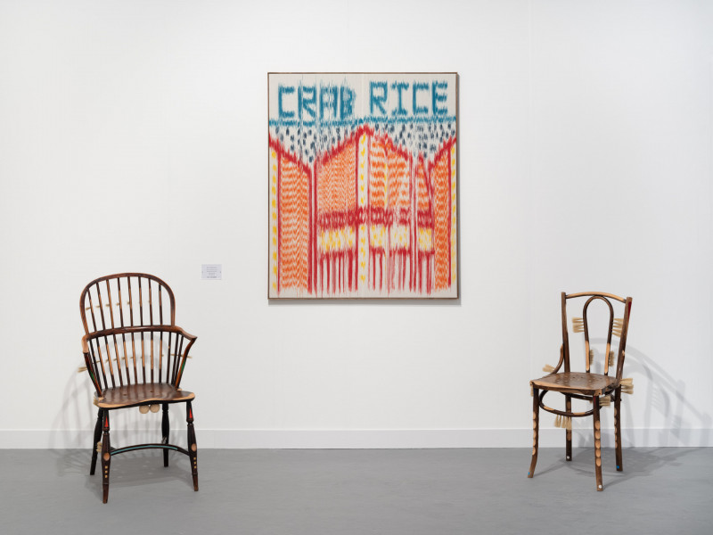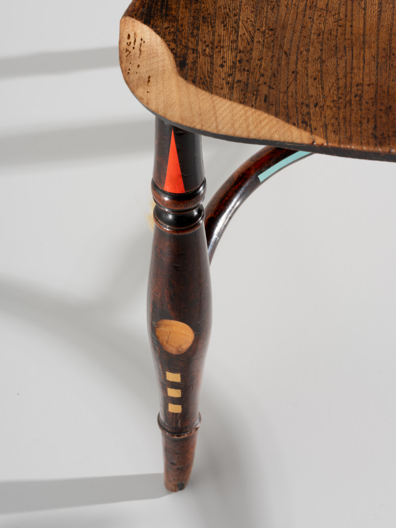 By sanding and chipping off parts of the chair frame, he created a fluted pattern, that at points revealed an even more elaborate pattern made by woodworms. Kobayashi also repaired the cane webbed seat and bag by individually tying together the web with coloured yarn, leaving the ends long and furry.