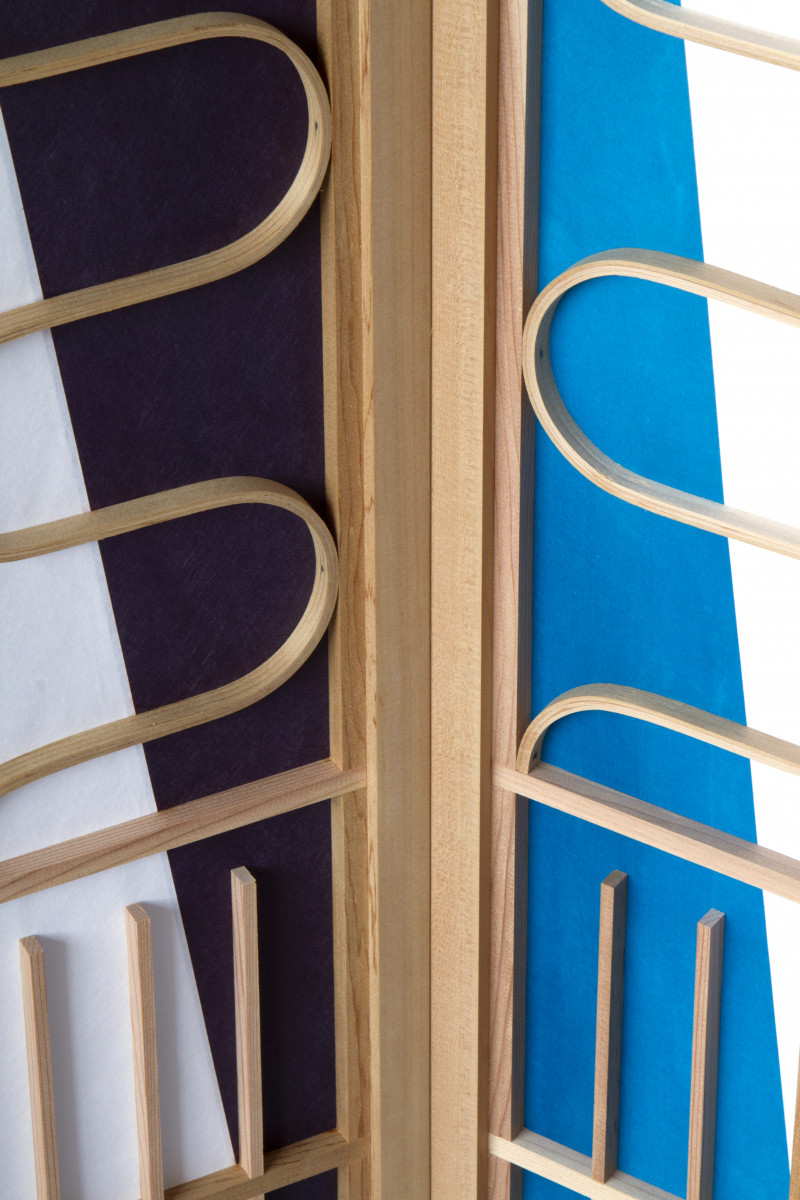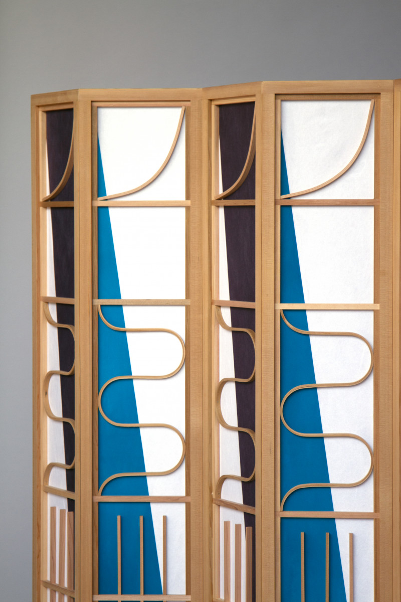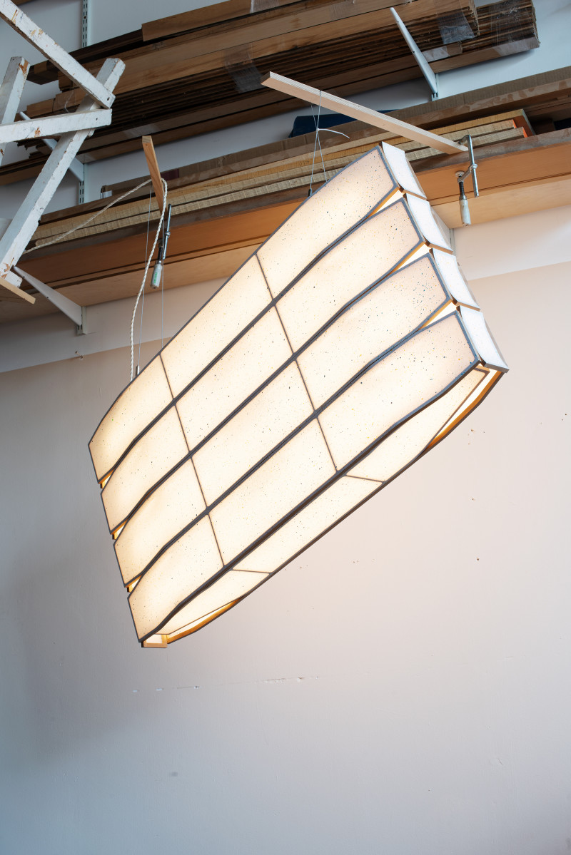 Kobayashi created two types of screens and designed some smaller objects such as wall lamps, shelvings and chest of drawers. These are made with solid cedar wood and every detail is cross jointed or stretched into thesections. The paper on the back is glued with starch glue, which gives it extra strength and nicely diffused light that comes through. Kobayashi explains: ‘I see huge potential in being creative with the patterns of wood structures in combination with the Japanese shoji paper that could be customised.’