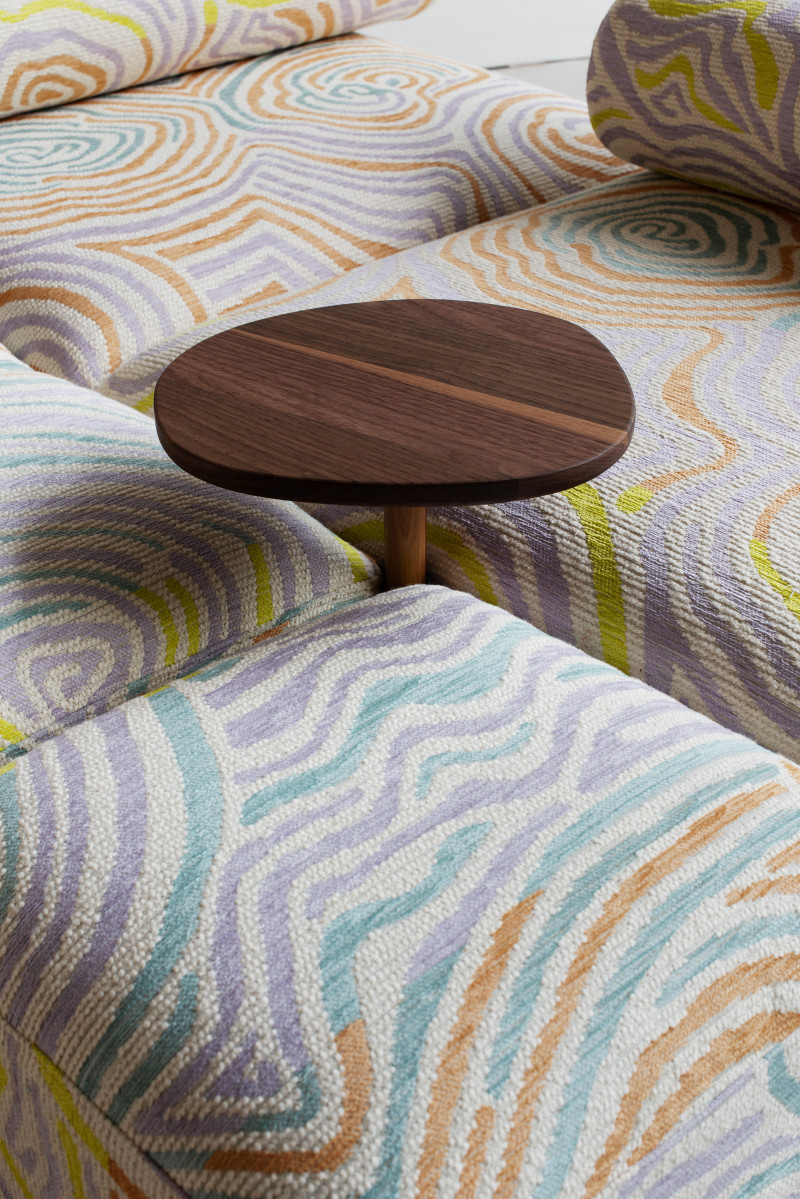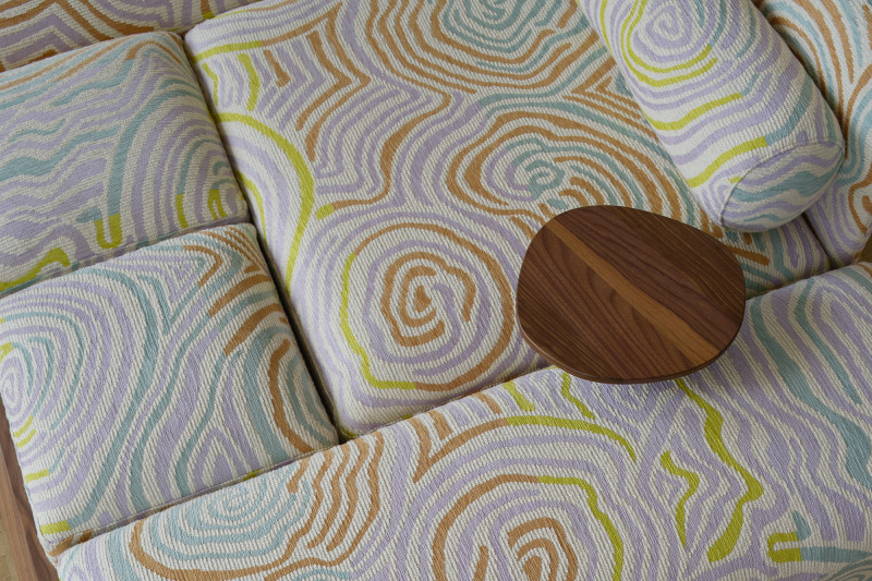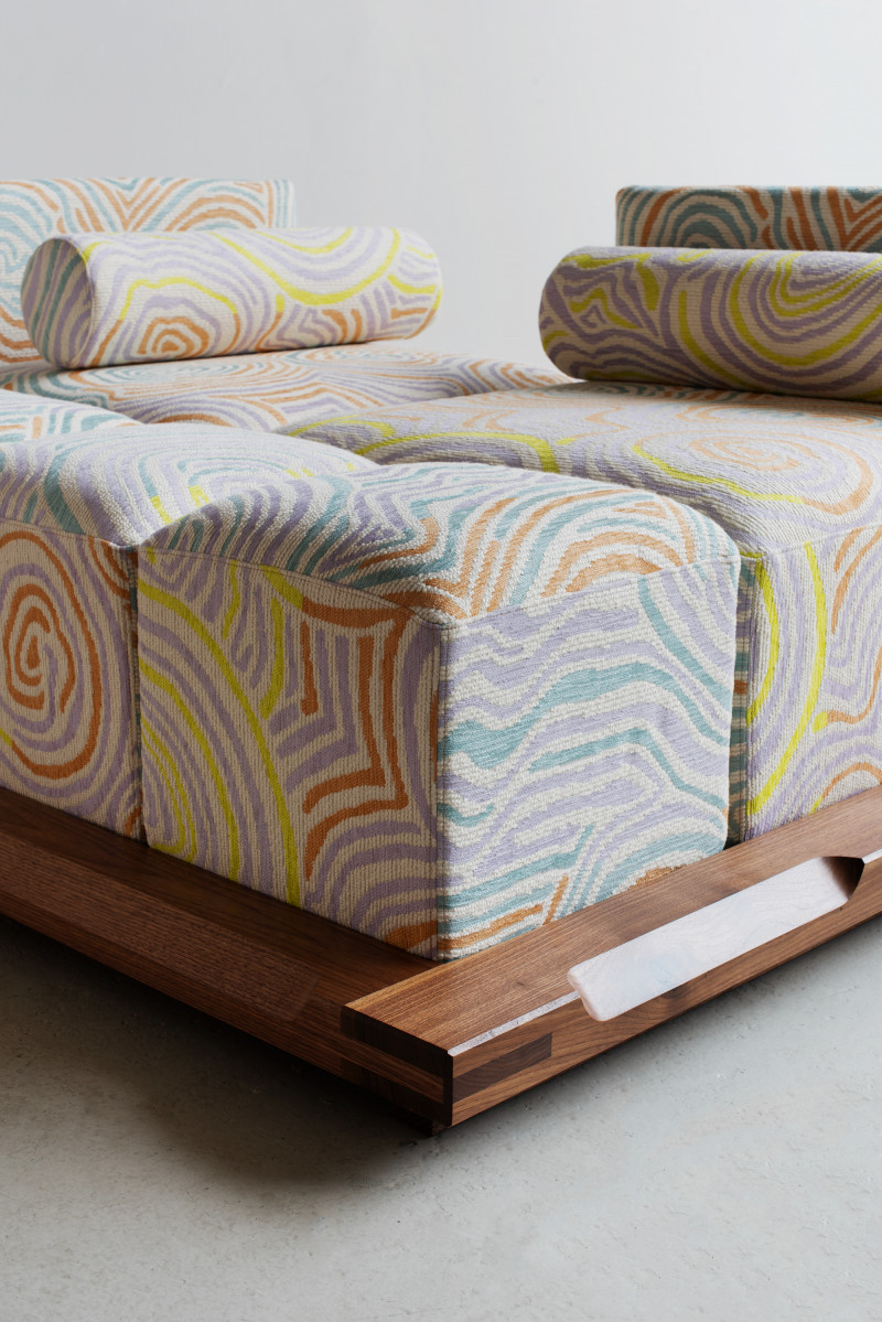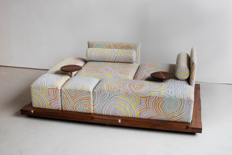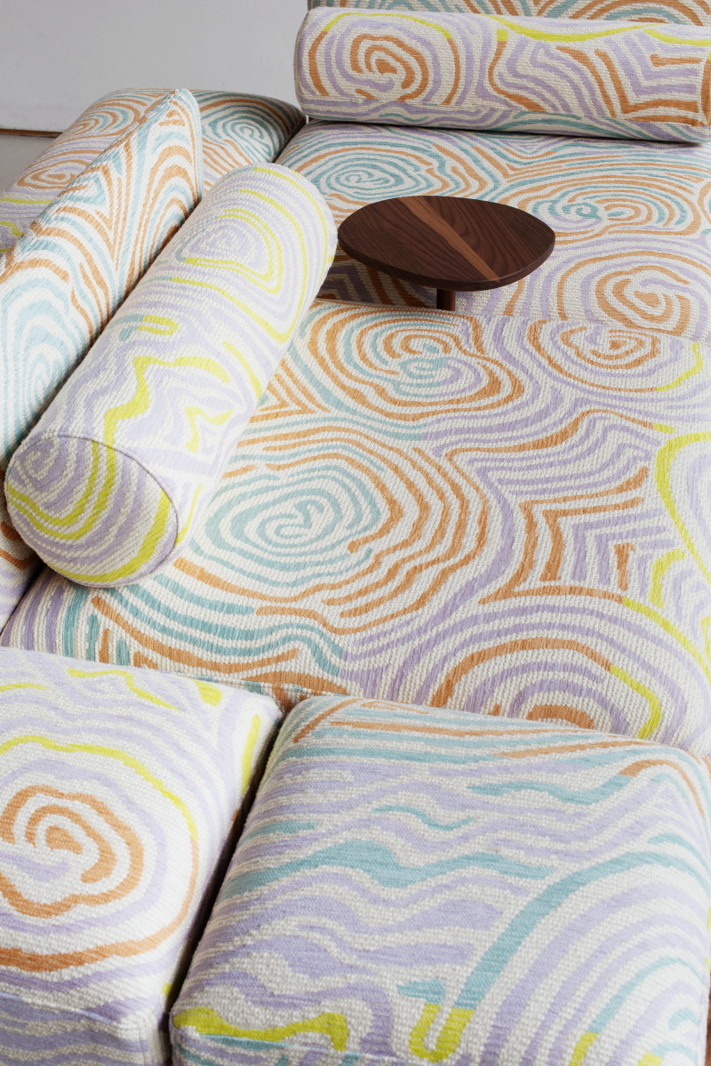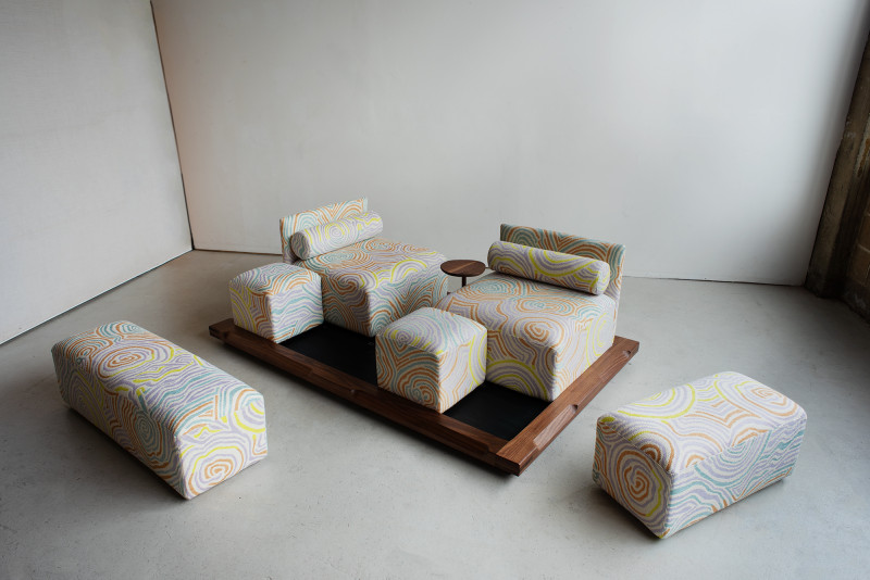 The name ‘Piece of Cake’ humorously reflects Kobayashi’s experience in designing his inaugural upholstery piece.Accustomed to creating his designs in his own workshop, the upholstery design process demanded a more holistic approach to crafting a convivial object, as well as a newfound attention to detail in textile.The Piece of Cake Sofa is covered with textile from Peter Pilotto x Christopher de Vos’s “Phase 02” collection.