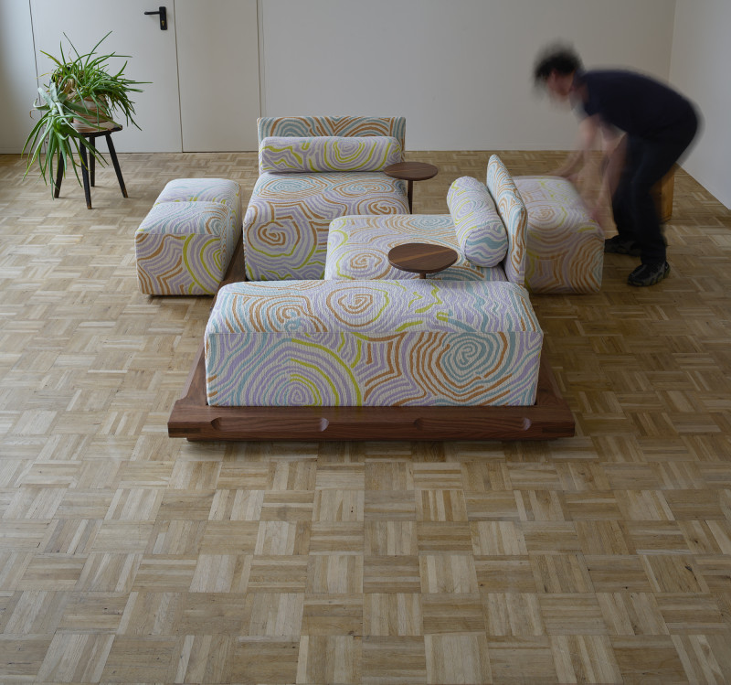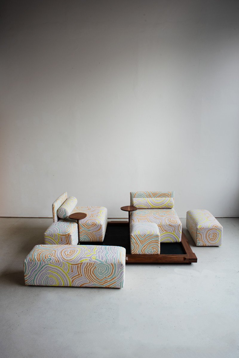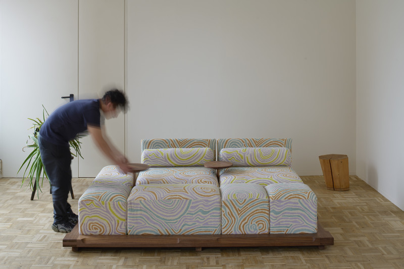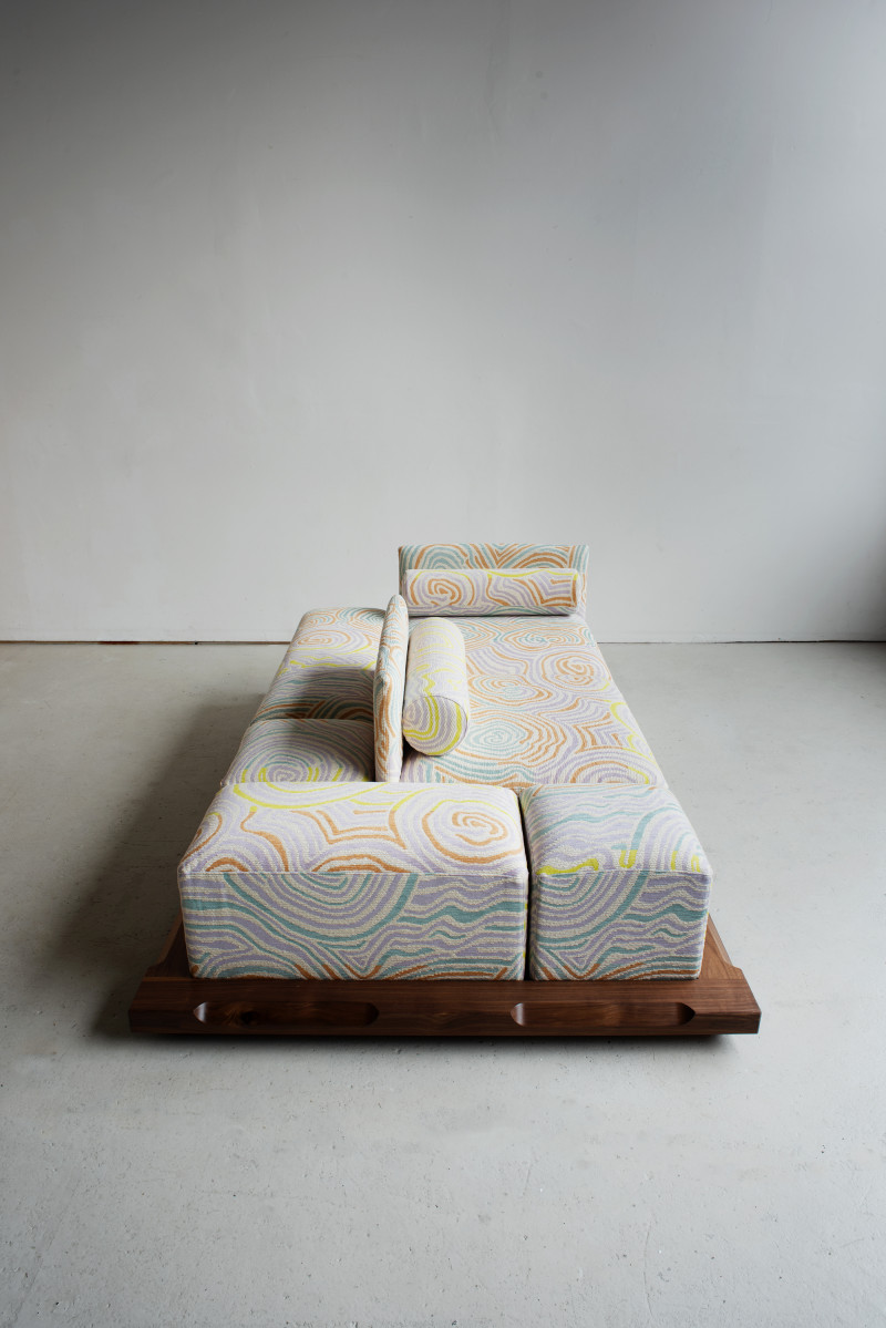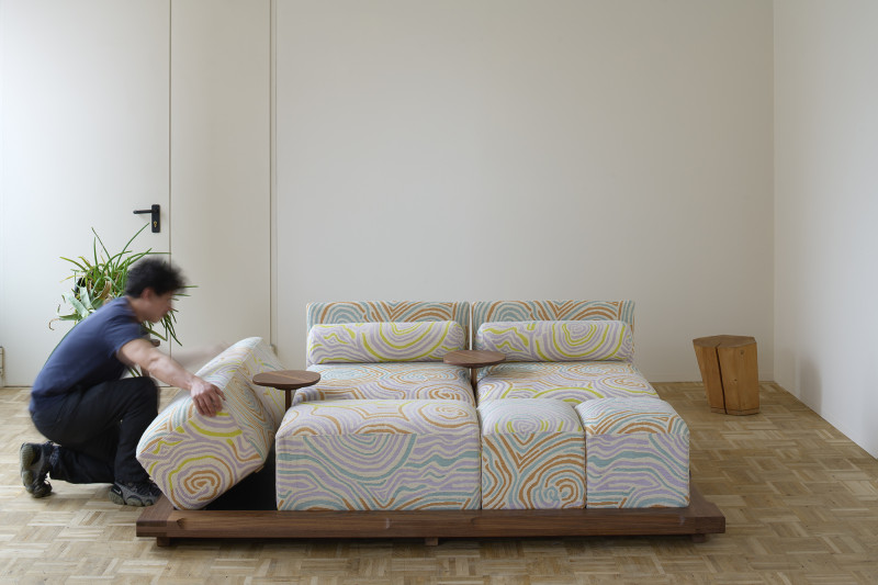 The “Piece of Cake Sofa” represents Kobayashi’s debut in upholstery. This convivial yet simple sofa, created in collaboration with designer Flavia Brändle, invites playful exploration of modularity.