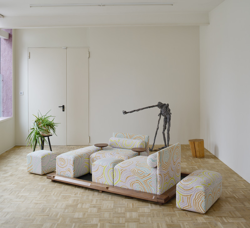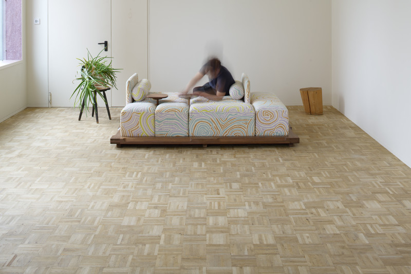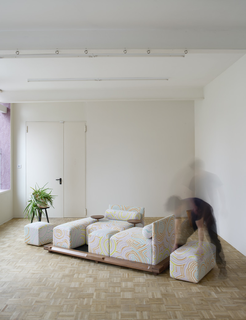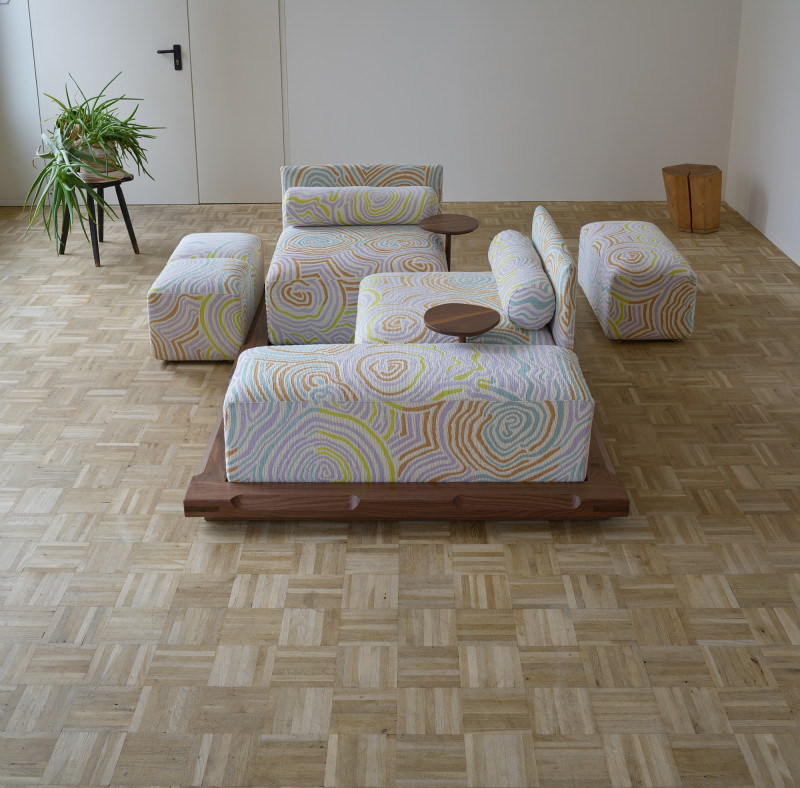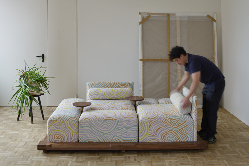 The “Piece of Cake Sofa” represents Kobayashi’s debut in upholstery. This convivial yet simple sofa, created in collaboration with designer Flavia Brändle, invites playful exploration of modularity.