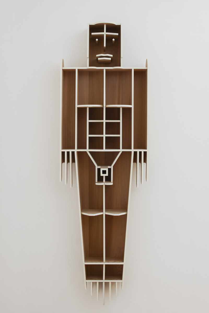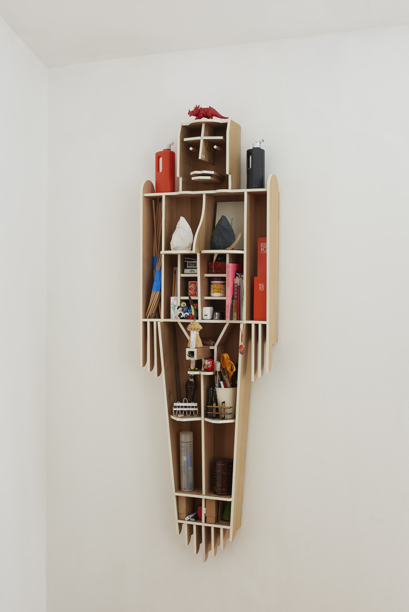In this sculptural shelf design, Kobayashi combines the robotic and the human, the male and the female, the dead and the living and home storage and artful crafts. Kobayashi’s core idea is that a shelf shows a lot about the personality of the owner. This thought inspired him to create a shelf that has its own persona. There are all features of a human body from head to toes, where sometimes we can see a robotic expression and other times we see a stylised human character in a combination of line drawing and volumetric shapes. The expression changes with the angle from which the shelf is viewed.
